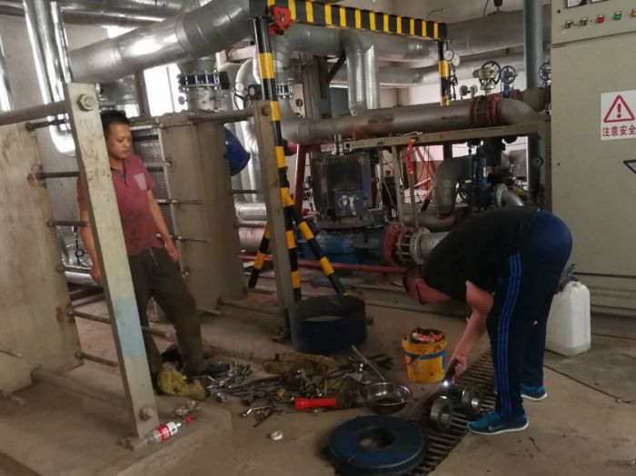 第一站為運營二所儲運熱力站,站內一派忙碌的檢修景象,檢修人員正在拆解75KW循環(huán)泵。據(jù)運營二所檢修助理尚帥介紹,此臺循環(huán)泵于2005年投入使用,運行期間,可供儲運小區(qū)、會計學校、煤炭大廈、以及中華家園一期等居民用熱。在拆解過程中發(fā)現(xiàn)循環(huán)泵電機線包有燒焦處并且發(fā)黑,電機端蓋也磨損嚴重。副經理劉強仔細查看,囑咐二所人員針對老、舊設備工況應及時采購更換以保證冬季采暖期熱用戶的用熱保障。隨后,前往運營三所恒大G區(qū)熱力站進行安全檢查,站內檢修人員正在清洗除污器。