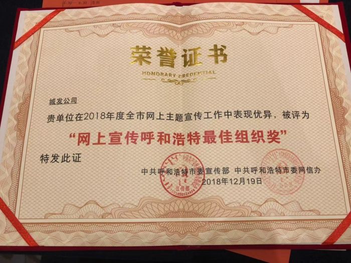 年度網(wǎng)上宣傳呼和浩特最佳組織獎。